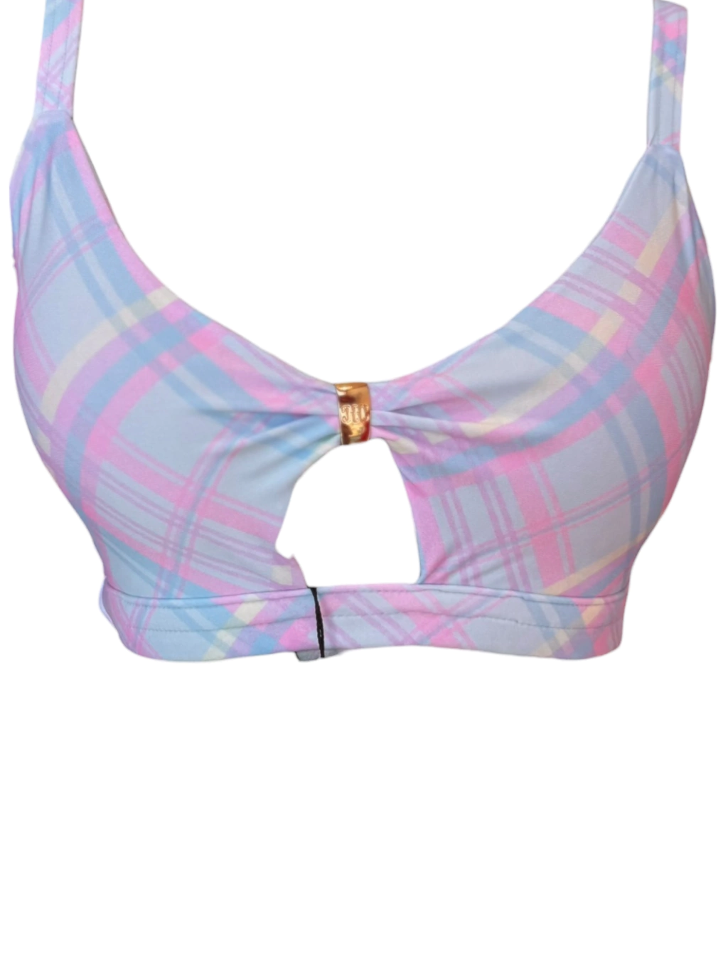 Top de biquíni de alta sustentação com alças largas com regulagem, lateral larga e bojos grandes. Possui pingente de metal banhado no centro (removível). Material: 84% POLIÉSTER E 16% ELASTANO.
