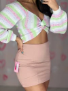 Short saia de cintura alta com zíper e botão, sem bolsos. Short fica somente por baixo, não aparecendo. Material: crepe de alfaiataria.